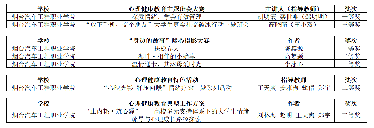 胡明霞、栾世唯同学主讲(邹明明老师指导)的《探索情绪,学会有效管理》,在心理健康教育主题班会大赛中斩获一等奖殊荣;陈鑫源同学的《扶稳春天》在“身边的故事”暖心摄影大赛中获评一等奖。由王天爽、姜雅梅、甄倩、郑宇老师打造的《“心映光影 释压向暖”情绪疗愈主题系列活动》和高梦颖同学的《海畔・相伴的小确幸》分别获评心理健康教育特色活动、暖心摄影大赛二等奖。三等奖包括,刘林海、赵明、王天爽、郑宇老师撰写的《“止内耗・筑心驿”——高校多元支持体系下的大学生情绪疏导与心理成长路径探索》,获评心理健康教育典型工作方案三等奖;高晓晴同学主讲(王小双老师指导)的《“放下手机,交个朋友”大学生真实社交破冰行动主题班会》获评心理健康教育主题班会三等奖;李茹心同学的《温情递卡,共沐母爱时光》同样拿下暖心摄影大赛三等奖。