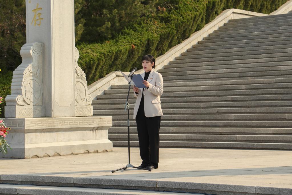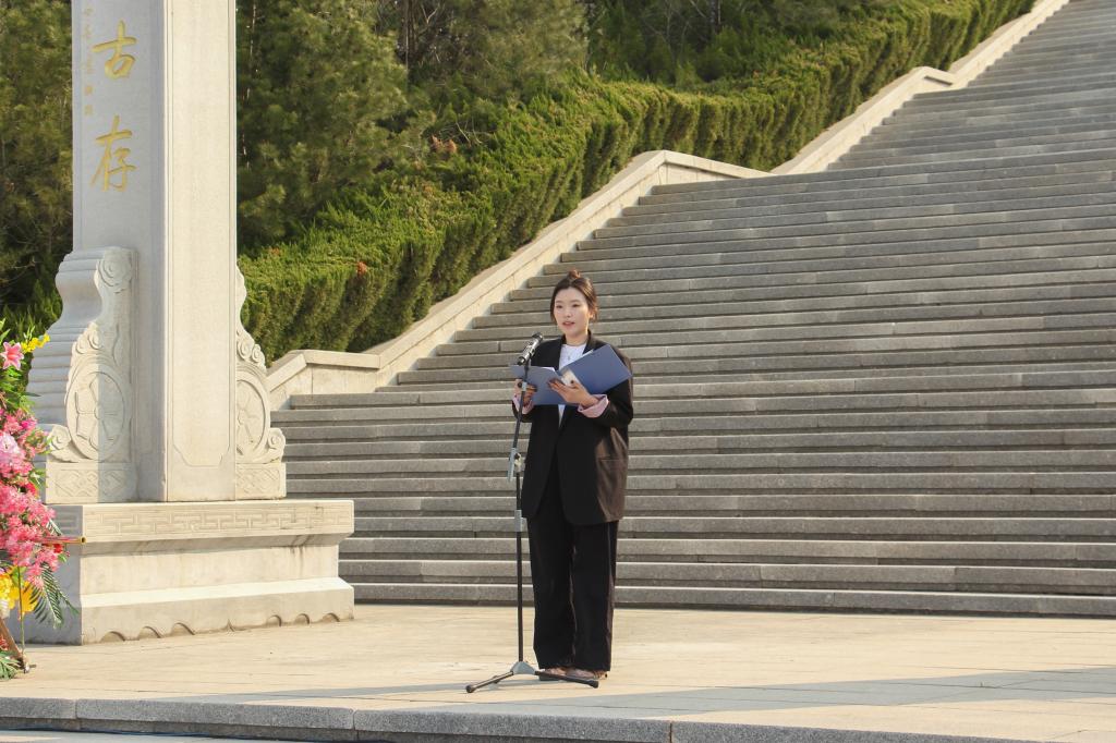 全体参与人员整齐肃立在英烈纪念碑下,神情庄重。伴随着雄壮的《义勇军进行曲》,全体人员齐声高唱。国歌唱毕,全场肃立默哀3分钟,现场寂静无声,唯有微风轻拂松柏,寄托着全体师生对革命先烈的深切哀思与崇高敬意。