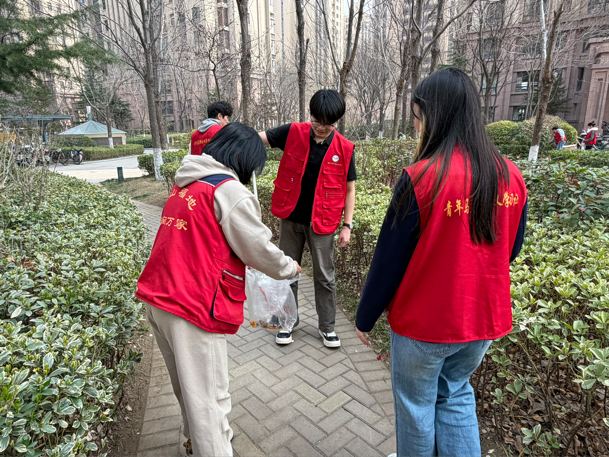 活动现场,志愿者们身着统一服装,手持扫帚、垃圾夹、抹布等工具,迅速投入到社区环境整治工作中。大家分工协作、干劲十足,重点对社区主干道、绿化带、楼道角落、公共健身区等区域进行全面清扫,细致清理落叶、纸屑、烟头等杂物,不放过任何一处卫生死角。面对堆积的杂物与顽固污渍,同学们不怕脏、不怕累,弯腰俯身、耐心清理,以饱满的热情投入劳动,用双手为社区“焕新颜”,改善社区公共环境,助力文明社区建设。