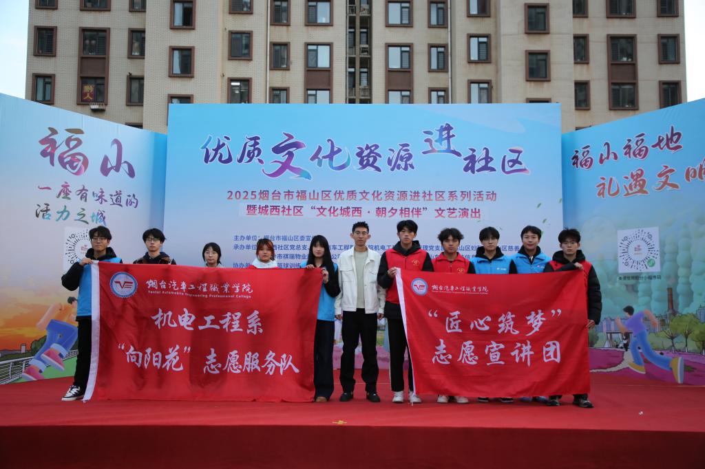 活动伊始,师生志愿者们积极投入“优质文化资源进社区”文艺演出的服务保障工作。本次演出由福山区委宣传部主办,城西社区党总支、烟台汽车工程职业学院机电工程系学生管理党支部、福山区妇联承办。从场地布置、秩序维护到引导协调,志愿者们热情周到、细致入微的服务,确保了演出的顺利进行,为社区居民带来高质量文化享受的同时,也展现了我院学子良好的精神风貌和奉献精神。