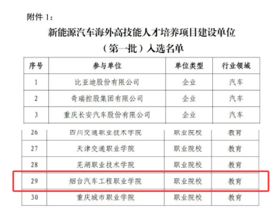 11月15日,全国汽车职业教育教学指导委员会与中国汽车工程学会联合发布《关于公布第一批新能源汽车海外高技能人才培养项目建设单位的通知》(汽车行指委〔2025〕74号),烟台汽车工程职业学院凭借深厚的汽车职业教育底蕴、鲜明的专业特色及完善的人才培养体系,成功跻身第一批新能源汽车海外高技能人才培养项目建设单位行列,标志着学院在职业教育国际化发展与新能源汽车人才培养领域迈出了里程碑式的一步。